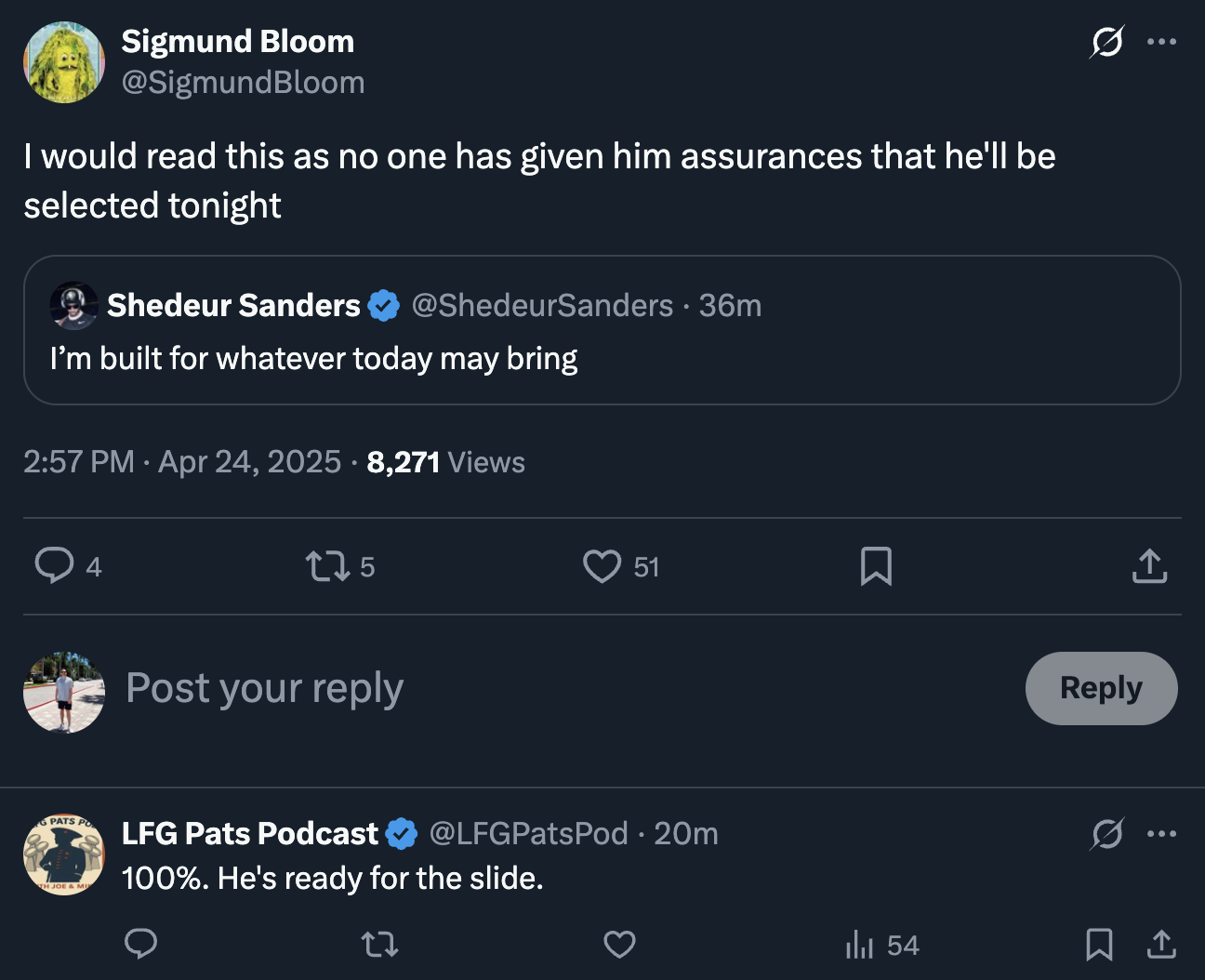 It appears that even Sanders himself knows it. On Thursday just hours before the draft, Sanders posted one final message on X. Fans couldn't help but notice that he was practically preparing himself for disappointment on the first night of the draft.