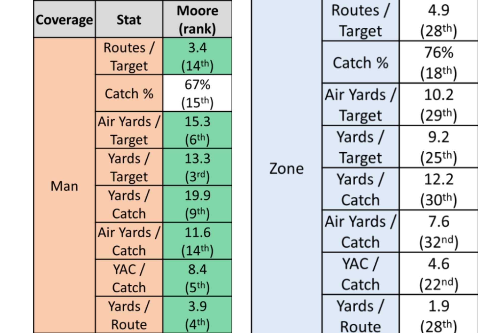DJ Moore was short to excellent against man coverage in 2023, standing out as one of the most frequently targeted wide receivers in the NFL against this type of defense (top-15 in the NFL).His performance was incredible along nearly every statistic when targeted.