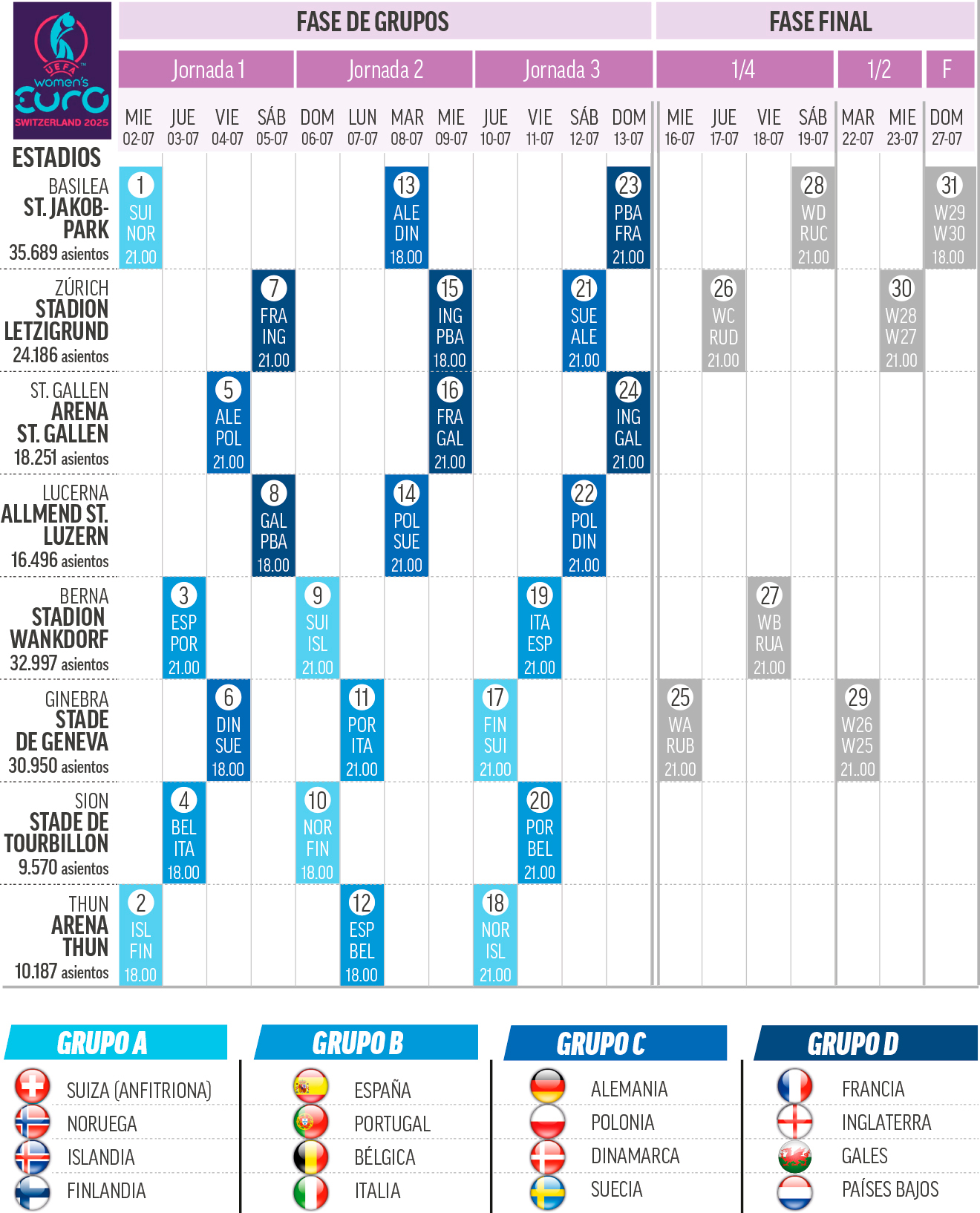 Suiza albergará la 14ª edición de la Eurocopa femenina que, entre el 2 y el 27 de julio, tendrá a 16 selecciones luchando por la corona continental. Entre ellas España, actual campeona del mundo y de la Nations League, que disputará la quinta fase final del campeonato europeo luchando por superar las semifinales alcanzadas en su primera participación en 1997 -después, en 2013, 2017 y 2022, su techo fueron los cuartos de final-.