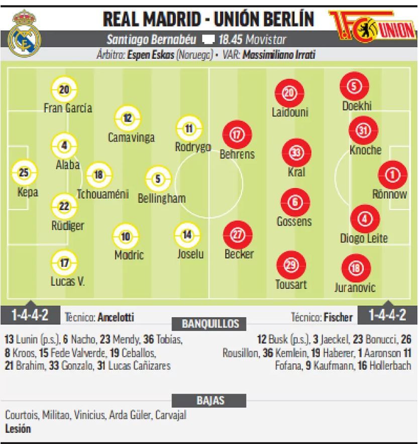 - Onces. Alineación probable del Real Madrid contra el Union Berlin hoy