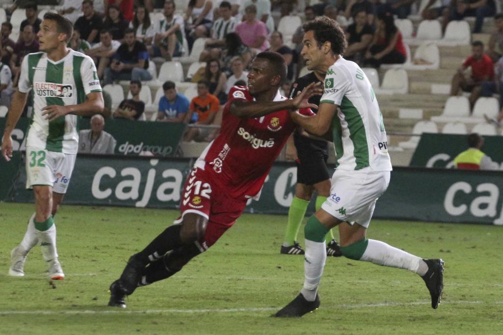 Dumitru y Quim Araujo se zafan en busca de una buena posición / LarreaLa segunda mitad arrancó con una gran ocasión visitante, en una acción personal de Uche en la que el nigeriano se hizo sitio con un gran remate pero disparó al lateral de la red. La jugada no tuvo continuidad y el Córdoba volvió a controlar el partido, por lo demás tenso y con demasiadas faltas. Los de Sandoval llegaban sobre todo a balón parado, aunque sin remate final.