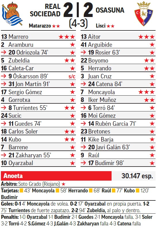 Boyomó casi marcó en su portería nada más empezar el tiempo extra, Zakharyan disparó flojo a las manos de Aitor, y el recién entrado Budimir cabeceó al larguero, antes de que Javi Galán diese al balón con la mano y esta vez sí Soto Grado mandase a los 11 metros una pelota que Aitor le detuvo a Oyarzabal, luciéndose también el portero visitante ante los remates de Kubo y Jon Martín, para llevar la ronda a los penaltis.