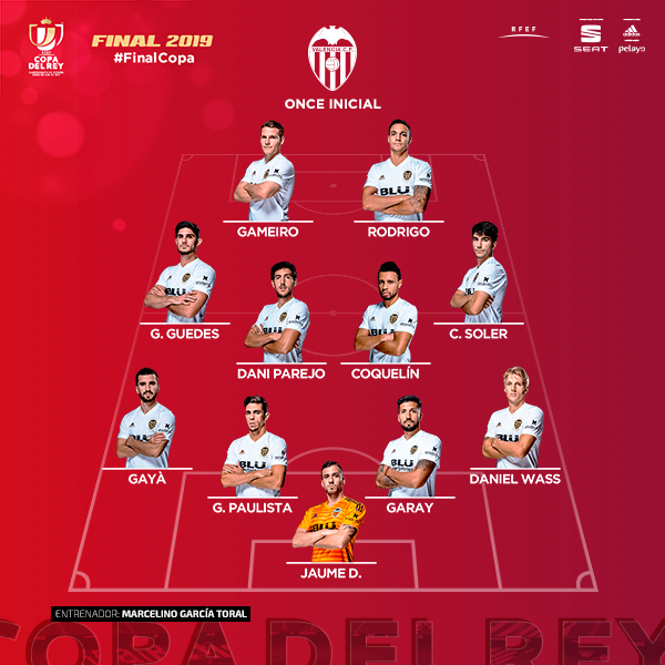 El Valencia, por su parte, juega de inicio con Jaume, Wass, Garay, Gabriel Paulista, Gayá, Soler, Coquelin, Parejo, Guedes, Rodrigo Moreno y Gameiro.