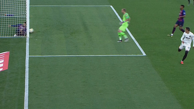 ¡¡MADRE MÍA CILLESSEEEEEEEEEEEEEEN!! Balón largo para Rodrigo, Piqué cede forzado a Cillessen, que pone el pie y le pasa el balón por debajo. Por suerte para él, el balón no encuentra portería. Será córner.