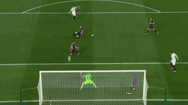 ¡¡,LO QUE HA FALLADO RODRIGOOOOOOOOOOOOOOOOOO!! Falla Lenglet desde el suelo un pase hacia el centro, se la regala a Rodrigo, que regatea a Cillessen y dispara a puerta vacía. La saca Piqué en la línea de gol.