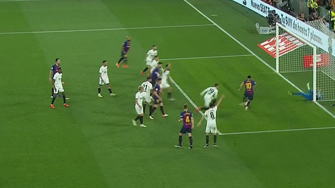 Córner que remata Lenglet en el primer palo, el balón lo saca Jaume con una parada espectacular y le cae a Messi, que la empuja a placer. Le habilitaba Soler, que se había quedado colgado en el primer palo.