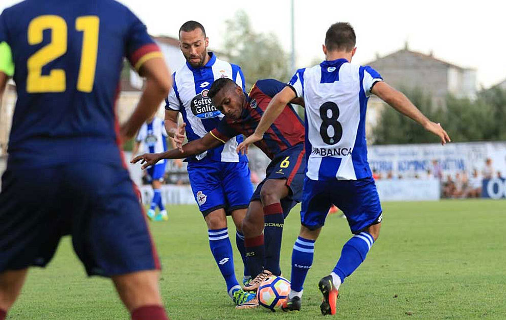 Para inaugurar el marcador, los coruñeses aprovecharon un saque de esquina que ejecutó el turco Emre Çolak y remató con el pie Nacho Monsalve, que este verano fue incorporado por el conjunto blanquiazul procedente del Atlético de Madrid para alternar el filial de Tercera División con el primer equipo. Cuatro minutos después, en otro córner, esta vez lanzado por el canterano Óscar 'Pinchi', Oriol Riera, máximo goleador de los deportivistas en la pretemporada, colocó en el fondo de la red.