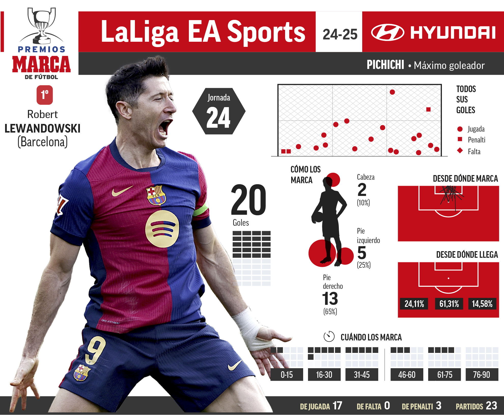 Robert Lewandowski (20 goles) mantiene la distancia con Kylian Mbappé (17 goles) en lo más alto de la lucha por el trofeo Pichichi de Primera división.