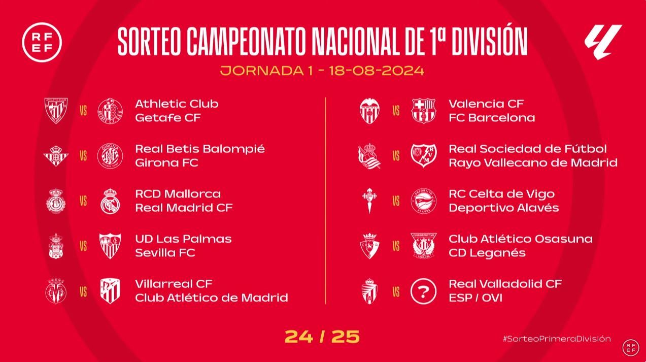 Los equipos que participarán en el sorteo del calendario de la nueva temporada 24-25 son: Alavés, Athletic, Atlético, Barcelona, Betis, Celta, Getafe, Girona, Las Palmas, Leganés, Mallorca, Osasuna, Rayo Vallecano, Real Madrid, Real Sociedad, Sevilla, Valencia, Valladolid, Villarreal, y el ganador del playoff de ascenso que se conocerá el domingo con el partido que enfrenta al RCD Espanyol con el Real Oviedo.