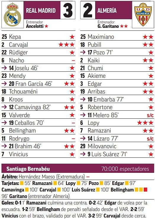 El Bernabéu asistió a un partido histórico. El Real Madrid remontó un 0-2 al descanso tras un primer tiempo espantoso con un gol de Carvajal en el minuto 99' y no, no había prórroga. El descuento de récord fue producto de tres revisiones de VAR que cayeron todas a favor del equipo blanco: penalti por mano en un córner, gol anulado al Almería que era el 1-3 por falta previa, y gol de Vinicius que había sido anulado previamente por mano del brasileño.