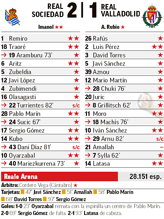 La Real Sociedad superó por 2-1 al Valladolid en el Reale Arena, pero el marcador no refleja lo sucedido en el partido, ya que en las dos partes comenzó mejor el conjunto visitante, que por las paradas de Álex Remiro no marcó, algo que sí hizo Mikel Oyarzabal, antes del descanso, y Sergio Gómez, después, para dejar en casa tres puntos muy valiosos en la pelea por Europa, ya que la diana de Latasa llegó muy tarde.