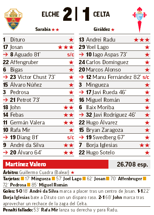 No hay quien pueda con el Elche. Su victoria ante el Celta le mantiene en puestos de Champions League y conserva una jornada más su condición de invicto en LaLiga. Ya se puede proclamar sin miedo a equivocarse que el conjunto ilicitano es el equipo revelación de la temporada. El Celta sigue sin encontrar la victoria y tras cinco empates consecutivos, todos ellos a uno, suma una derrota que deja al equipo en la zona baja de la clasificación.