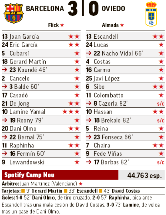 El partido ya estaba donde quería el Barça y el Oviedo sólo deseaba que pasaran los minutos cuanto antes. Un nuevo fallo a la hora de sacar el balón propició el tercer tanto local. Centro medido de Dani Olmo y remate de volea en escorzo de Lamine Yamal. El 10 azulgrana, que siempre destaca por sus regates y sus asistencias imposibles, rubricó su gran partido con un golazo que acompañar a la presión que hizo ante Carmo en la jugada del 1-0. Cada día destaca en nuevos registros y pocos se acuerdan ya de esa pubalgia. Tras el gol fue sustituido bajo una gran ovación con un partido más que cerrado en el que sólo hay que destacar los minutos que Almada dio a Cazorla para que se despidiera del Camp Nou como merece. Los aplausos que recibió bajo la granizada final lo dicen todo.