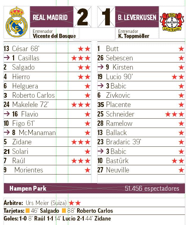 Fue la final de Zidane ("El gol de Zizou es una obra de arte, una acción que es pura estética, de una espectacularidad que se ve pocas veces en el fútbol y menos en una final", dice Del Bosque; la de Casillas, que fue suplente al lesionarse César ("Aún hay noches en las que me despierto viendo aquellas paradas", cuenta Berbatov, cuando se le recuerda la final al delantero búlgaro que era del Leverkusen en 2002), pero no solo de ellos.