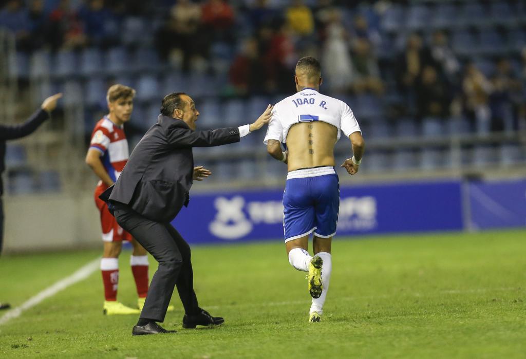 Joao Rodríguez celebra el gol del empate delante de Oltra y con Pozo al fondo / S. FerreroEl líder controló el juego y apenas sufría con alguna arrancada de Suso, pero Rui Silva únicamente fue exigido a balón parado, con una sencilla parada tras un cabezazo de Alberto. Eso sí, el Granada sólo inquietó a Dani con un centro-chut de Fede Vico (32') al que no llegó Ramos. Para entonces, el Tenerife había perdido a Nano, lo que llevó a Montañés al centro para dar cabida a Joao en la banda. Ninguno hizo olvidar a Malbasic.