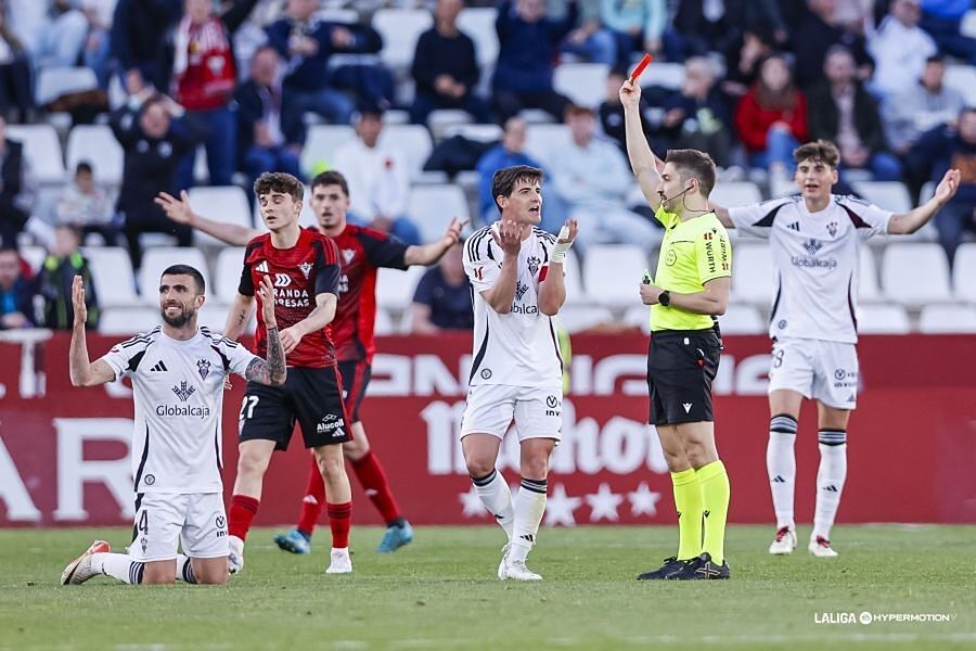 El Albacete se quedó con un jugador menos en el 79'. Agus Medina controla, se escurre y derriba a Lachuer en línea de tres cuartos. Roja directa y muy discutida. Los rojillos se volcaron en busca del tanto que les diese la victoria y el liderato. En el 90', Lizoain tocó lo justo para desviar el remate de cabeza de Butzke, que golpeó el palo. Los de Lisci siguieron acumulando ocasiones claras en el tiempo añadido. Pero Juan Gutiérrez regaló un balón en el último suspiro y el Alba no lo desaprovechó. Otro centro desde la izquierda, ahora de Pablo Sáenz, lo empujó Higinio para hacer el 3-2 y desatar la locura en el Carlos Belmonte.