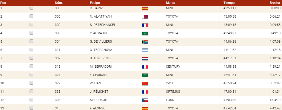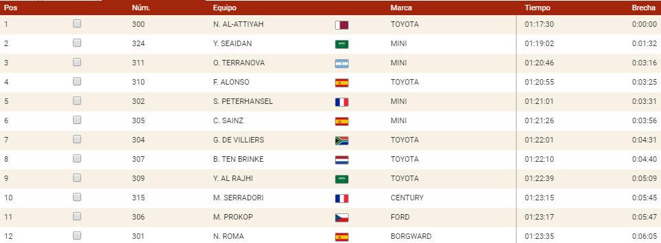 La lucha por el segundo puesto finalmente ha caído del lado de Al-Attiyah, que hoy al menos ha conseguido un triunfo de etapa, el único que ha logrado en este Dakar, y ha asegurado el segundo escalón del podio ante la presión a la que le había sometido en los últimos días Stephane Peterhansel, que completará el podio.