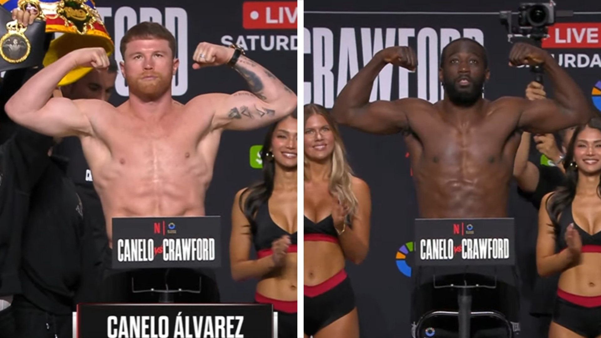El pesaje publico de Canelo vs Crawford se llevó a cabo este viernes 12 de septiembre a las 7:00 p.m. (tiempo del centro de México) donde todos los boxeadores de esta velada de sábado pasaron a la báscula sin problema alguno.