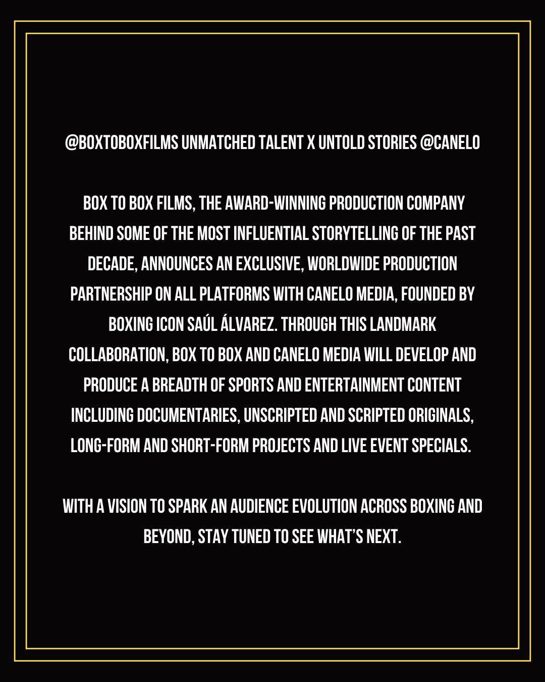 "Me entusiasma enormemente dar la bienvenida a Canelo Media a mi creciente cartera de negocios. Este proyecto busca dar vida a historias jamás contadas, superar los límites creativos y construir una plataforma líder en deportes y entretenimiento. Siempre he creído en trabajar junto a los mejores en sus respectivos campos, y con Box to Box he encontrado al socio ideal para lograrlo", declara Álvarez.