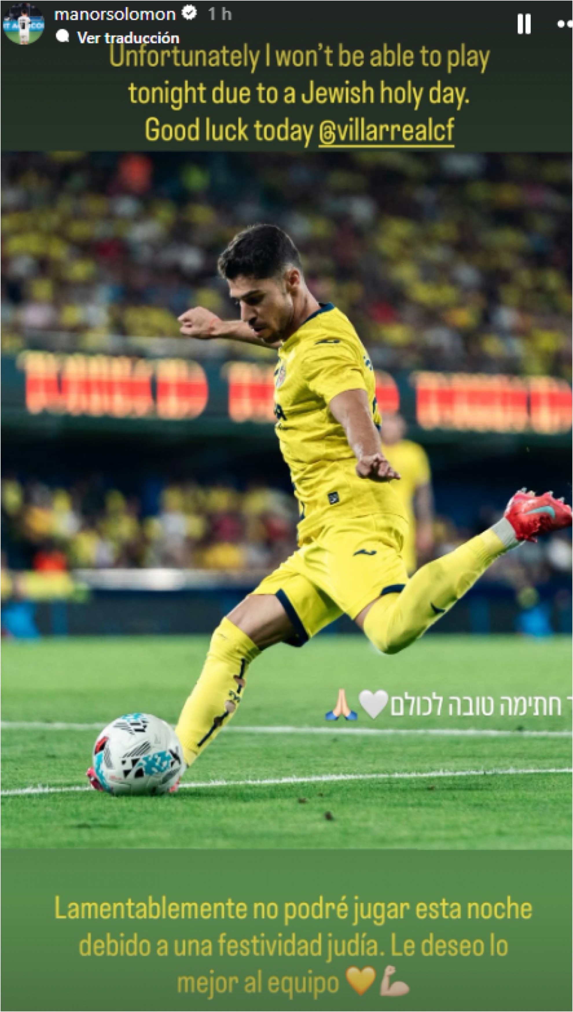 Manor Solomon será baja en el encuentro de esta noche entre el Villarreal y laJuventus. El extremo israelí se ha descartado para el próximo compromiso alegando un motivo religioso: la celebración de Yom Kipur, Día de la Expiación, el día más solemne del calendario judío.