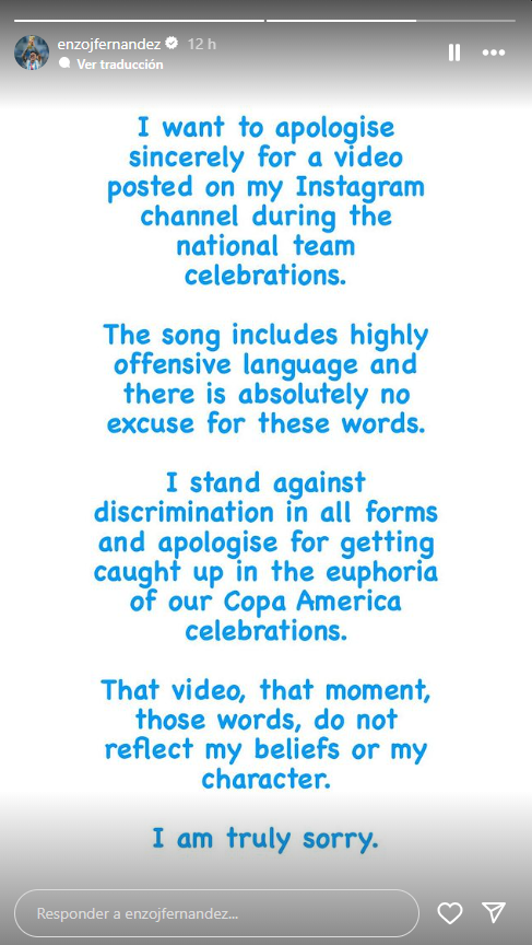 "Quiero disculparme sinceramente por un vídeo publicado en mi canal de Instagram durante las celebraciones del equipo nacional. La canción incluye un lenguaje muy ofensivo y no hay absolutamente ninguna excusa para estas palabras", expresó Enzo.