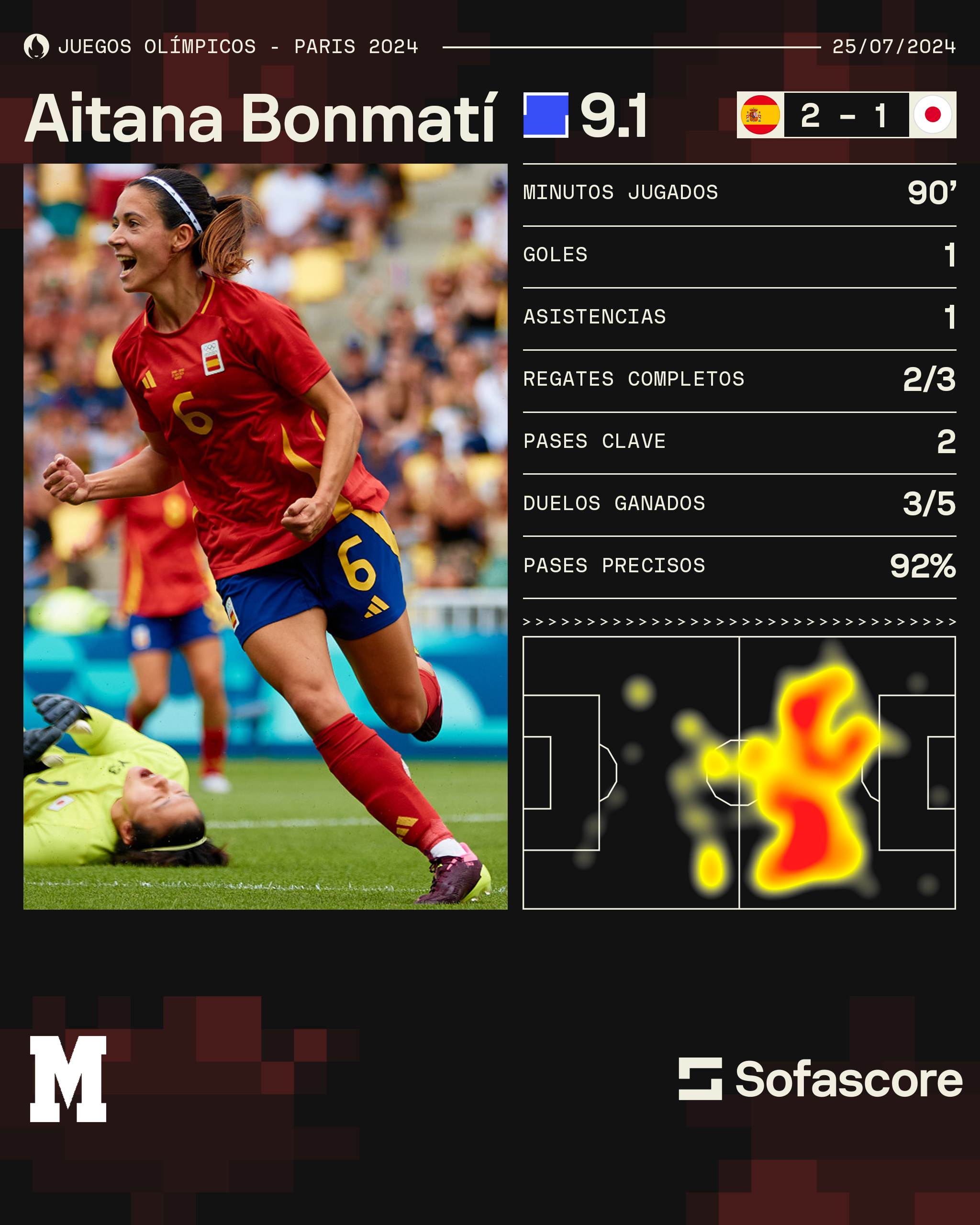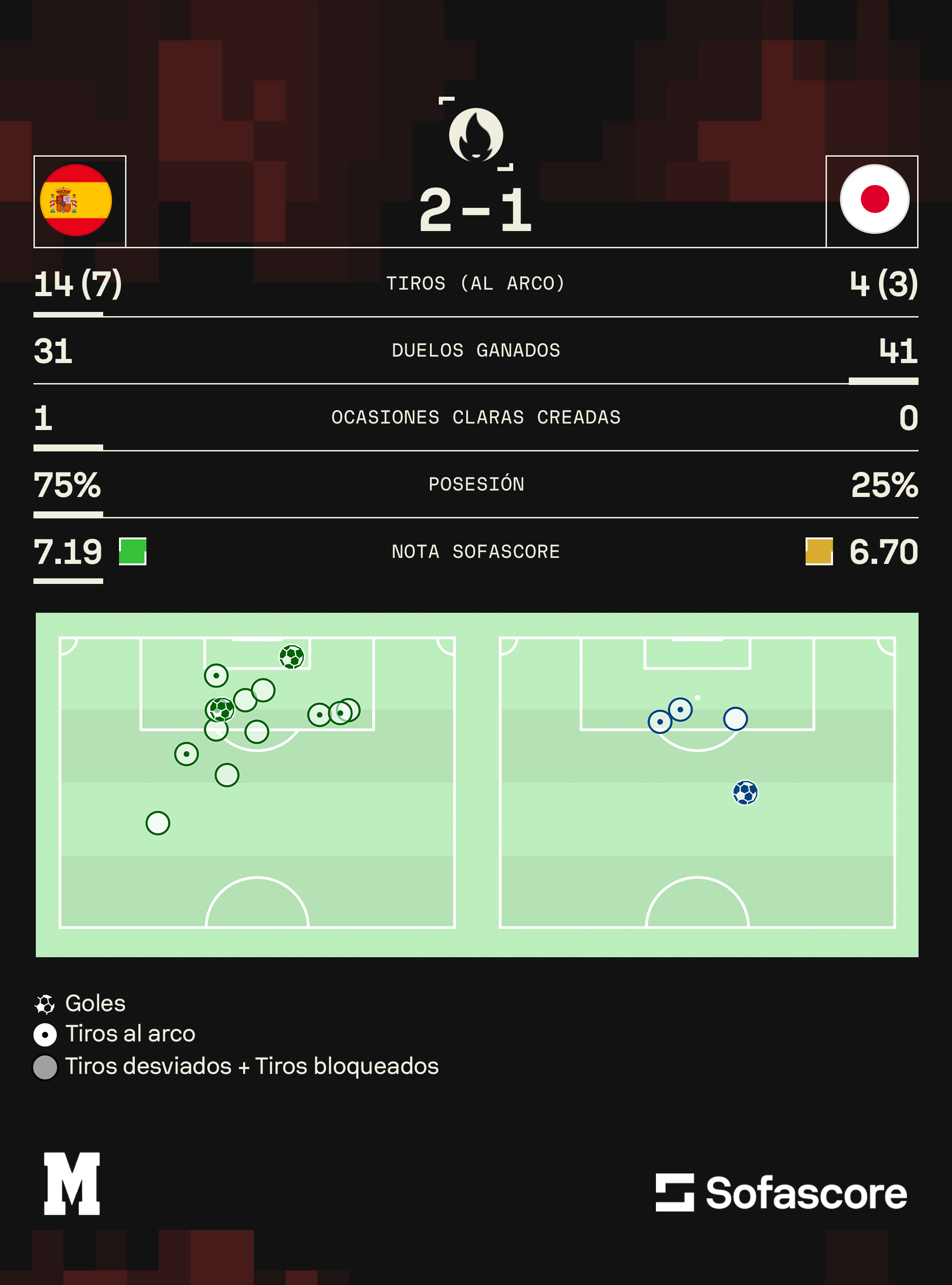 Al 13', Aoba Fujino aprovechó una jugada a balón parado para mostrar la calidad que tiene en su pierna derecha. La jugadora nipona observo la barrera española, se enfiló e impactó de forma magistral el esférico para colocarlo en el ángulo superior izquierdo de la portería defendida por Cata Coll, silenciando así a la afición de La Roja por unos minutos, con una anotación que seguramente será recordada como una de las mejores en los juegos de París 2024.