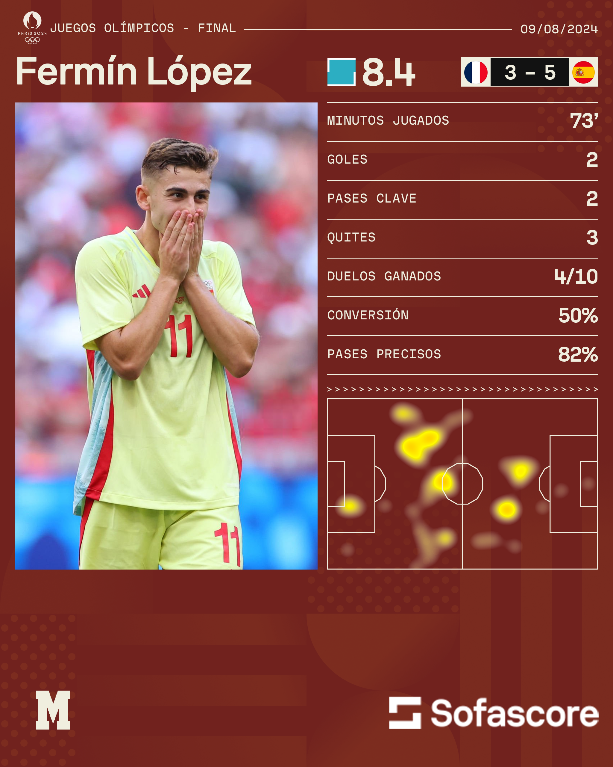 El joven del Barça no se quedó conforme y cuando la afición española seguía saboreando su primer anotación, los volvió a levantar de sus asientos con su segundo gol del partido. Un ataque por la banda acabó en rechace, que aprovechó Fermín para marcar su doblete que acercaba a la medalla de oro a La Roja.
