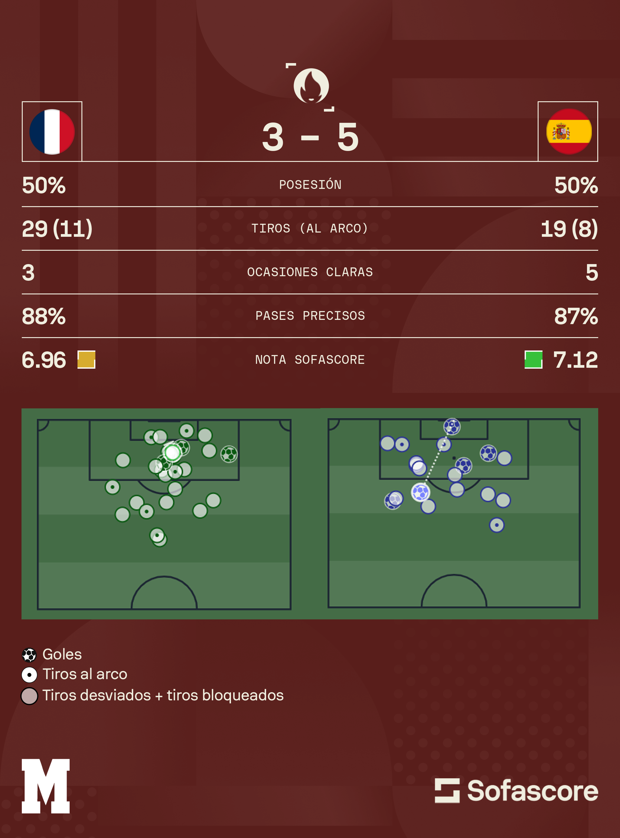 España sufrió, pero al final consiguió su segundo oro olímpico de su historia en el futbol varonil tras vencer 5-3 en tiempo extra a Francia en el Parque de los Príncipes. Fermín y Camello fueron las figuras del partido con dos goles cada uno, que encaminaron a la selección española a coronarse en los Olímpicos 2024 que se disputan en París.