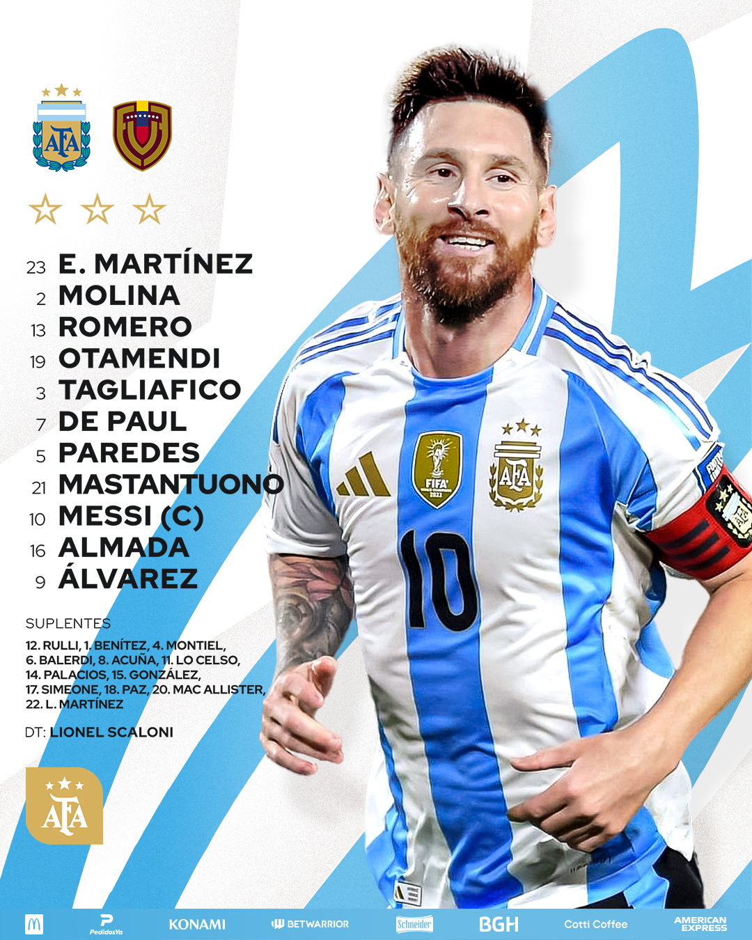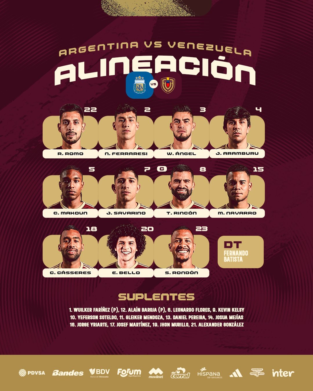 La Argentina dirigido por el estratega Lionel Scaloni, se mide ante la Vinotinto de Fernando Batista en uno de los partidos del jueves del Eliminatorias de Conmebol, como parte de la Jornada 17 de la Clasificación al Mundial 2026.