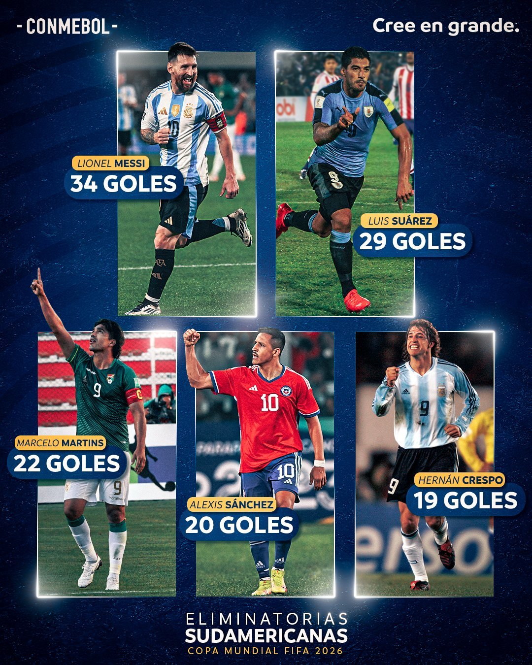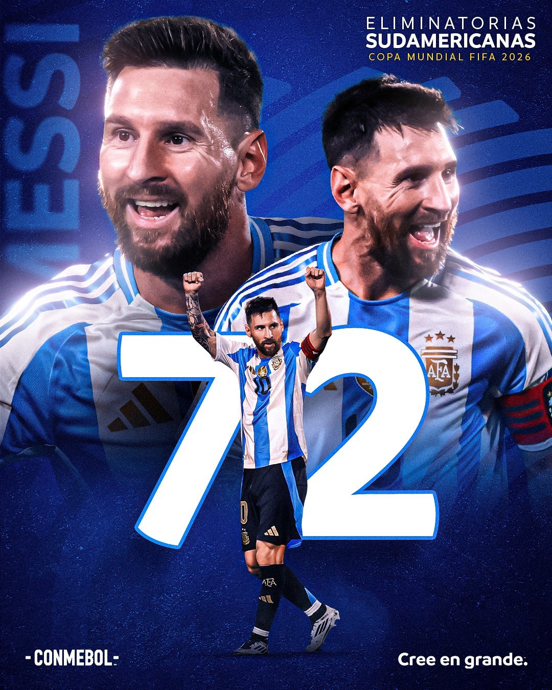 Con su aparición ante Venezuela, Lionel Messi llega a 72 partidos eliminatorios en Sudamérica y empata al líder histórico Iván Hurtado, de Ecudador y con pasado en la Liga MX. El 10 de Argentina podría tomar la marca en solitario el martes en la visita justo a los ecuatorianos en el cierre de las Eliminatorias Conmebol