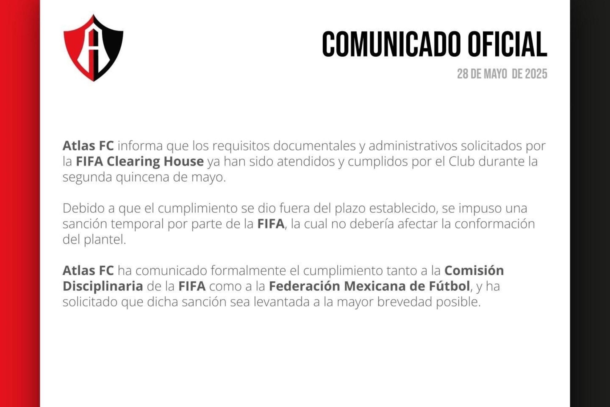 Lo más llamativo de este caso es que la FIFA no ha dado a conocer los motivos específicos de la sanción, aunque Atlas emitió un comunicado en el que aclara que ya han cumplido con los requisitos que les han solicitado, pero admitiendo que lo han hecho fuera de plazo, por lo que no saben realmente cuando le levantarán el castigo. El comunicado de Atlas, entre otras cosas, dice: "Atlas FC informa que los requisitos documentales y administrativos solicitados por la FIFA Clearing House ya han sido atendidos y cumplidos por el Club durante la segunda quincena de mayo". Y añade: "Debido a que el cumplimiento se dio fuera del plazo establecido, se impuso una sanción temporal por parte de la FIFA, la cual no debería afectar la conformación del plantel". El comunicado finaliza aclarando que ya han pedido el levantamiento de la sanción lo antes posible.