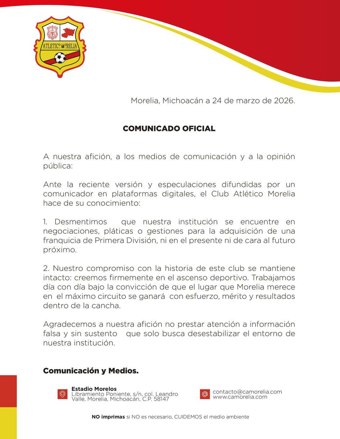 El Club Atlético Morelia compartió en un comunicado que no estaban en negociaciones para regresar a la Liga MX y que su objetivo de ascender sigue "intacto".