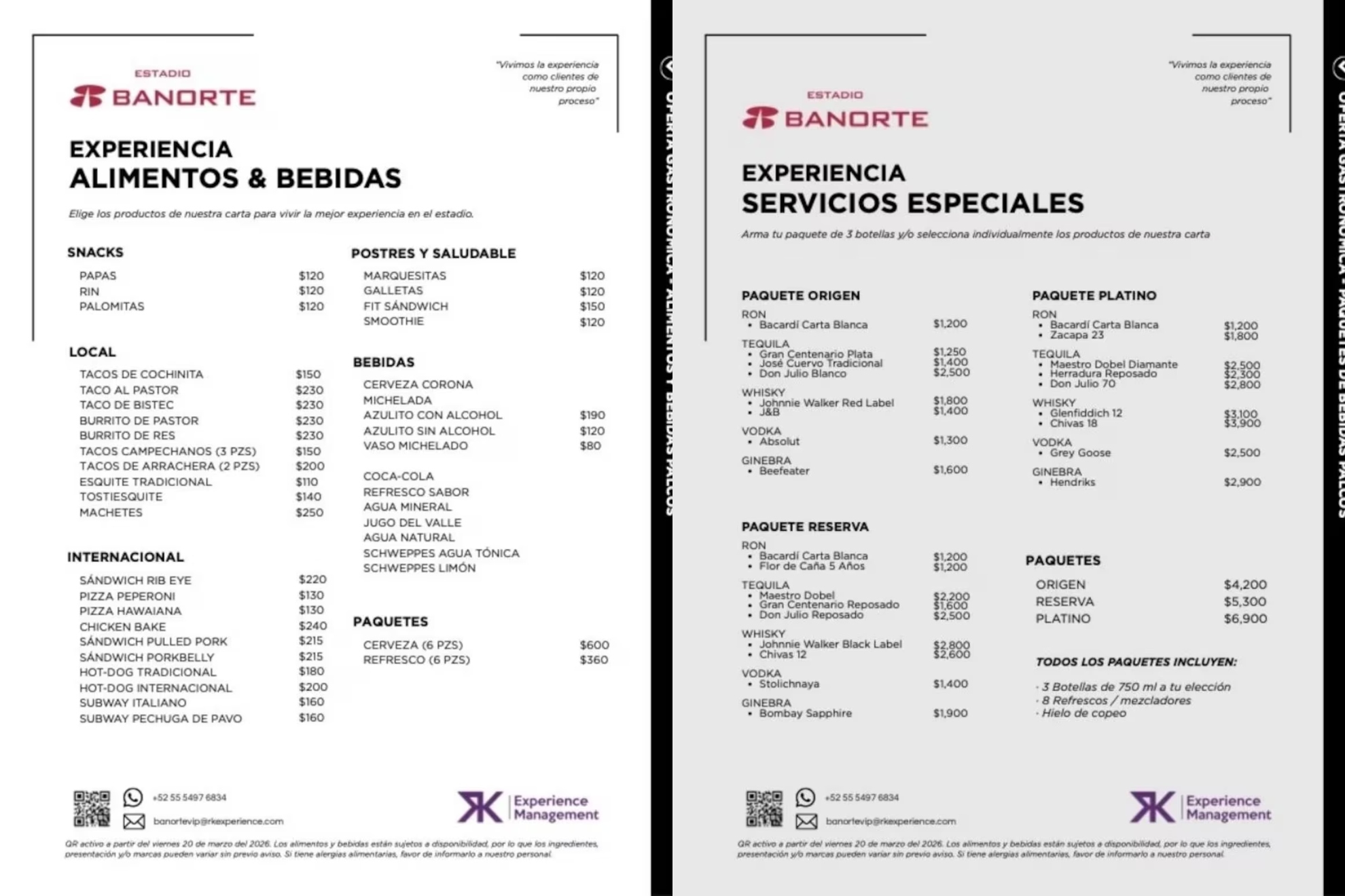 La otra parte del menú se llama Servicios Especiales, y cuenta con diversos paquetes para bebidas con alcohol, el primero de ellos es el Paquete Origen, que ofrece botellas de ron, tequila o whisky con precios que van desde los $1.200 pesos hasta los $1.600, también está el Paquete Reserva y Platino y todos ellos pueden alcanza un costo de entre $4.200 y $6.000 pesos.