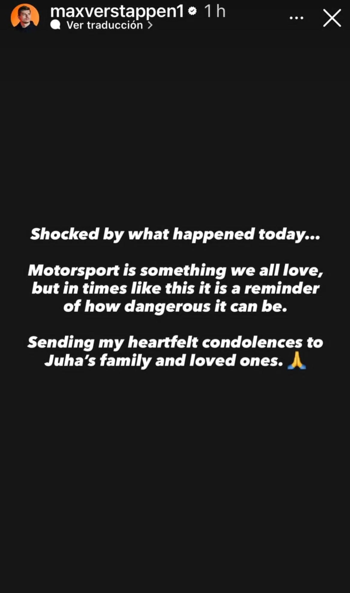 Verstappen ha sufrido muy de cerca todo lo que ha pasado y se mostraba tremendamente afectado por la terrible pérdida de un compañero que estaba compitiendo contra él. Y manifestó su tristeza en las redes sociales: "Conmocionado por lo sucedido hoy... El automovilismo es algo que todos amamos, pero en momentos como este, nos recuerda lo peligroso que puede ser. Mi más sentido pésame a la familia y seres queridos de Juha."