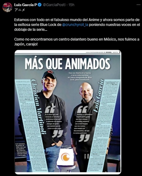 En su cuenta de X (antes Twitter), Luis García dio a conocer esta nueva faceta en su carrera con el siguiente mensaje: "Estamos con todo en el fabuloso mundo del Anime y ahora somos parte de la exitosa serie Blue Lock de @crunchyroll_la poniendo nuestras voces en el doblaje de la serie... Como no encontramos un centro delantero bueno en México, nos fuimos a Japón, carajo!".
