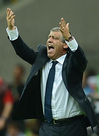 El seleccionador de Grecia, Fernando Santos, felicitó a sus jugadores tras empatar (1-1) ante Polonia en el partido inaugural de la Eurocopa 2012, en la que tuvieron que jugar con diez desde el minuto 44 por la expulsión de Papastathopoulos.