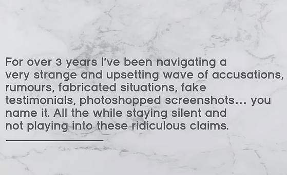 "For over three years, I've been surfing a very strange and annoying wave of accusations, rumors, made-up situations, false testimonials, photoshopped screenshots... you name it. All while remaining silent and not playing into the hands of these ridiculous claims.