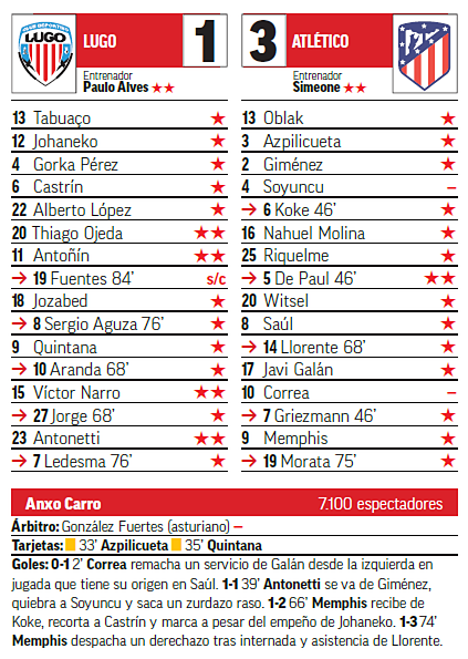 Cantaba la lógica que Simeone tomaría medidas más temprano que tarde, no tanto que fueran fulminantes: triple cambio del que salieron perjudicados Soyuncu, Correa... y Riquelme. Lo primero que pasó fue que el del silbato perdonó a Quintana una entrada que pudo resolverse perfectamente con roja directa pero que en todo caso era segunda amarilla. Lo segundo que pasó fue que el Lugo la tuvo clara para ponerse por delante: entre Giménez y Oblak regalaron otro córner, entre el travesaño y Giménez se apañaron vaya usted a saber cómo para sacar el cabezazo de Castrín.