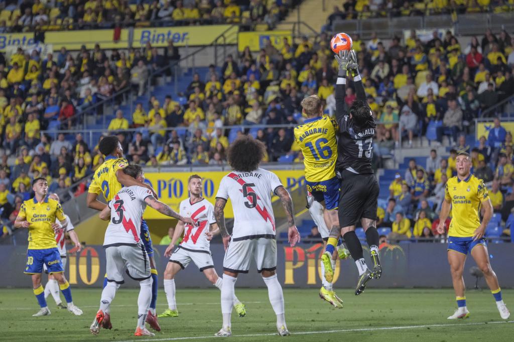 Estaba más cómodo en el campo el Rayo, con menor presión clasificatoria que Las Palmas. No es lo mismo soñar con Europa que sufrir por no descender. Manejaban más la pelota, y con más criterio, los vallecanos, que rozaban un 70% de posesión. A la UD, más imprecisa, le costaba más. Unai López lo intentó con un potente golpeo desde la frontal que salió desviado y respondió después Essugo, tras un pase de Januzaj, con un misil que se marchó más cerca de la portería. Crecieron los canarios y McBurnie, que luego en el 44’ reclamó un penalti, puso a prueba de nuevo a Batalla, que no atrapó de primeras, pero Óscar Valentín solventó el problema. Al escocés le falló después el control en el área, estaba muy forzado, todo hay que decirlo, para rematar un saque de falta de Januzaj. Hubo disparos, sí, más del Rayo, ocho, y tres de Las Palmas, pero el descanso asomó sin ocasiones claras.