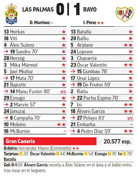 Avisó el Rayo y luego golpeó. Marcó Álvaro García. Demostró su clase para recortar a Álex Suárez en un palmo y rematar. Con algo de suspense, tras tocar en el larguero, acabó en la red. Era el 66'. La necesidad apretaba y la UD se encomendó a Moleiro, el jugador con más clase. Suyo fue un centro para un cabezazo de McBurnie... que lucha, pero no tiene gol. Lo intentaron los canarios y no les alcanzó. Ganó el Rayo y Europa lleva a la UD al infierno.