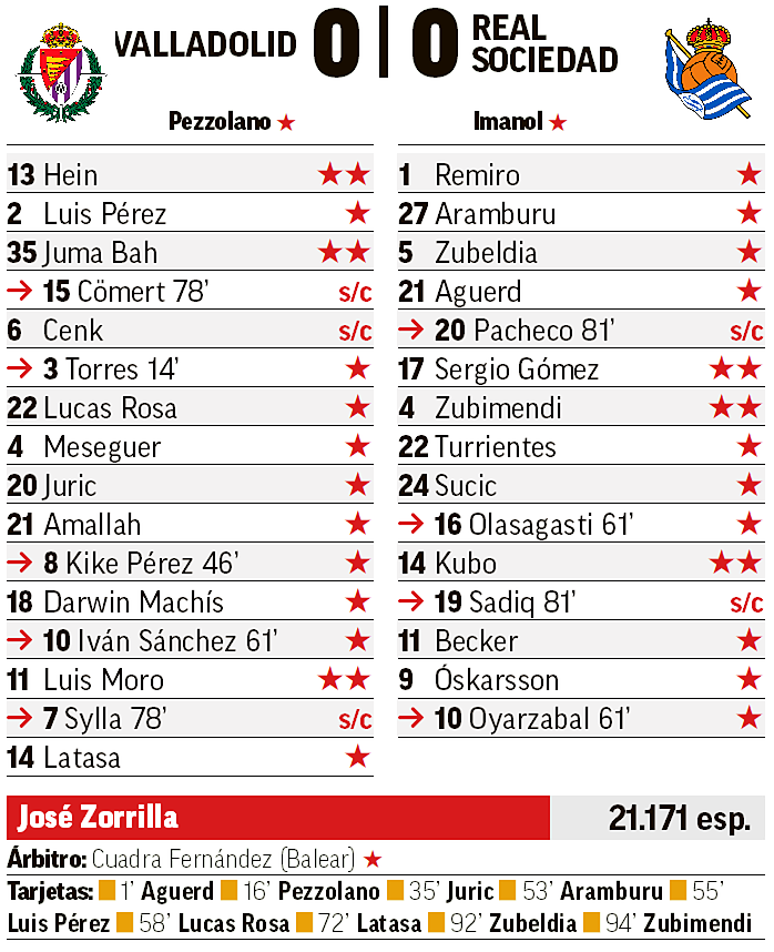El Valladolid y la Real Sociedad empataron sin goles en Zorrilla, algo difícil de entender después de ver el partido, ya que ambos equipos, sobre todo el de Imanol Alguacil, tuvieron ocasiones de sobra para marcar, pero no lo lograron. Locales y visitantes siguen con un solo triunfo en lo que llevamos de LaLiga.