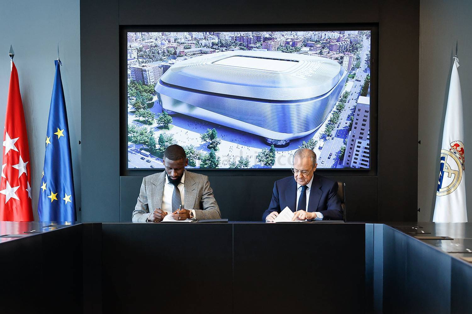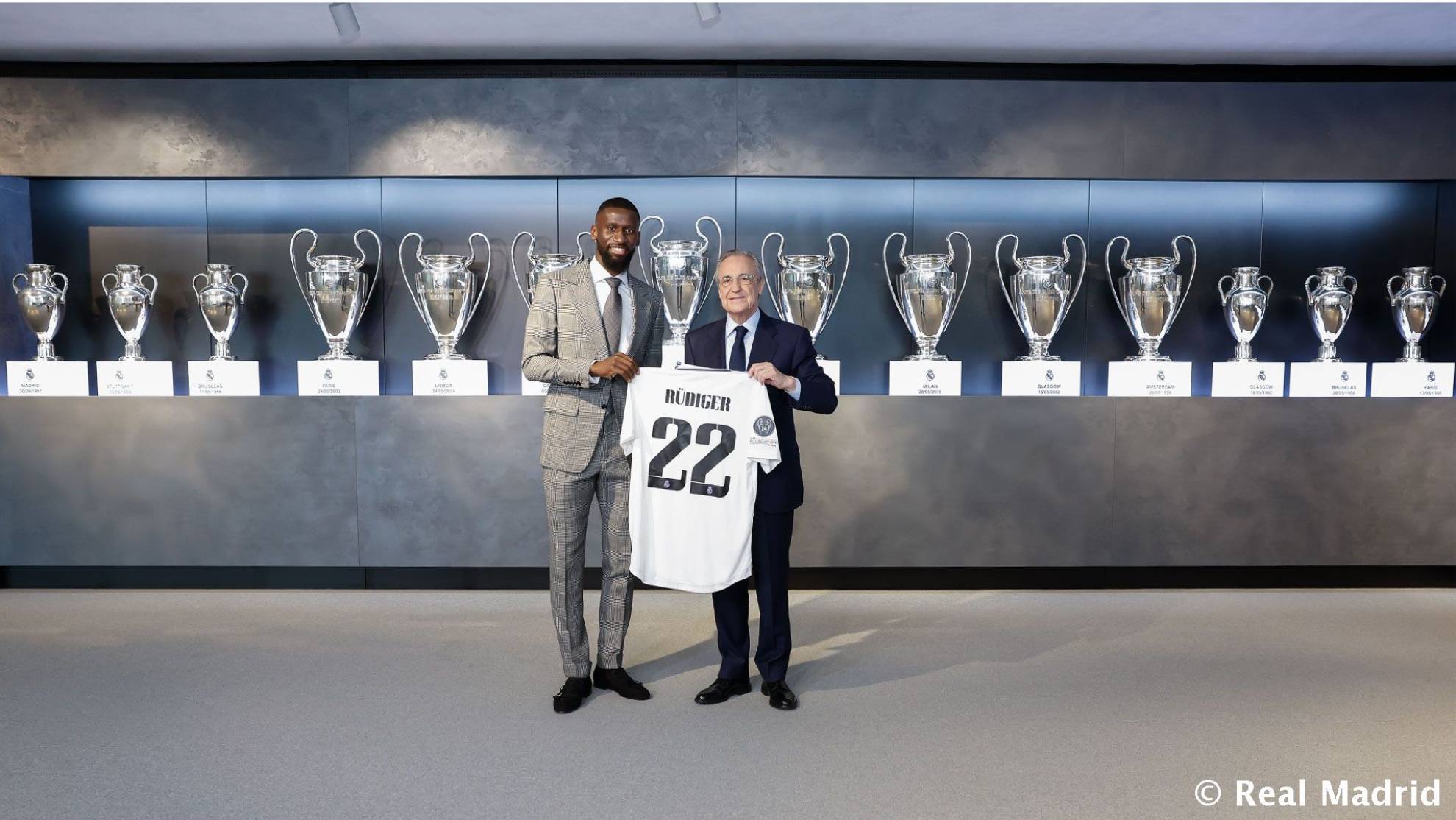 "Hoy vuelve a ser uno de esos días especiales. Viene al Real Madrid uno de esos jugadores que nos hará ser más fuertes, un hombre que se dejará el alma en cada partido. Un año más vamos a pelear por todos los títulos. Fortalecer y mejorar nuestra plantilla es todo un reto, porque nuestros jugadores forman parte de la leyenda del Madrid y del fútbol. Todo lo que se ha conseguido es porque los jugadores lo han dado, con el respeto y el no rendirse jamás como valores y porque nuestros jugadores son grandes madridistas. Y eso atrae a muchos jugadores y hoy tenemos una nueva demostración con uno de los mejores defensas del mundo. hoy damos la bienvenida a Antonio Rüdiger.