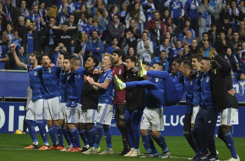 Los jugadores del Oviedo celebran el triunfo ante su afición / JAVIER GARCIASeguridad local