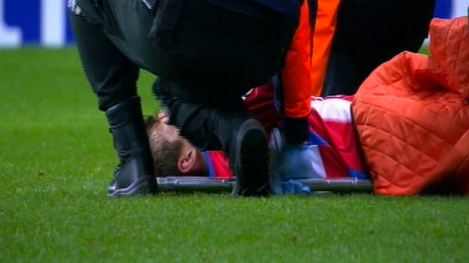 Joselu era el que había seguido la jugada. Isma Cerro abandona el campo en camilla y entre lágrimas.
