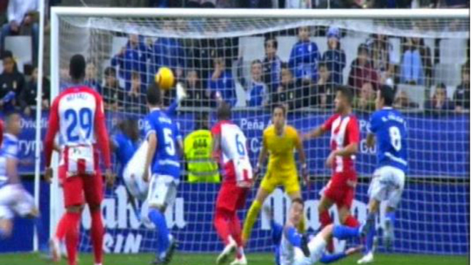 De espaldas a la meta rival, Ibra ha rematado de media chilena después de que el esférico fuera de cabeza en cabeza de sus compañeros y tras ajustar el cuero en el palo derecho de la meta que defiende Mariño, ha adelantado al Oviedo.