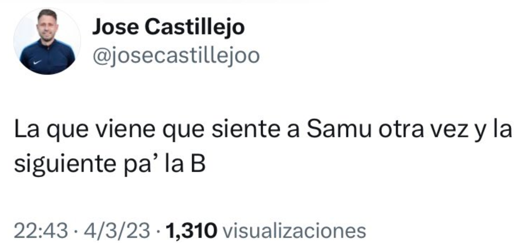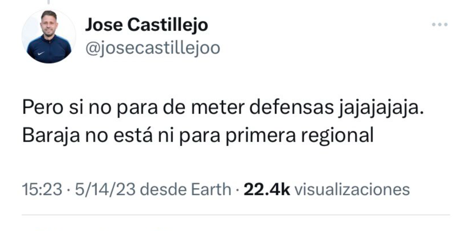Semanas después, el 14 de mayo, día del partido Celta - Valencia, en el que Castillejo se quedó en el banquillo, su hermano escribió: "Pero si no para de meter defensas, Baraja no está ni para Primera Regional".