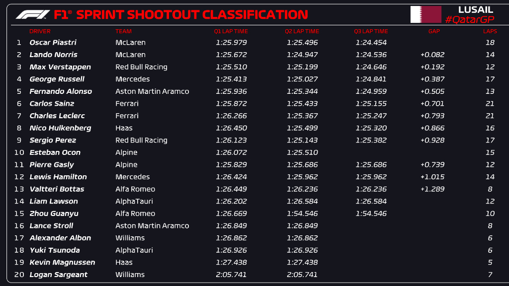 Respecto a las Ferrari, largarán la Carrera Sprint que se disputará en unas horas en el Circuito de Lusail en la tercera fila: Carlos Sainz concluyó 5º, mientras que Charles Leclerc un lugar detrás.
