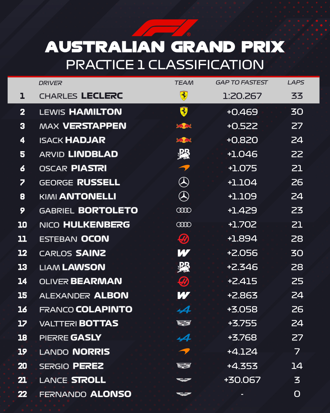 TOP 5 P1 GP Australia F1: LEC, HAM, VER, HAD, LIN