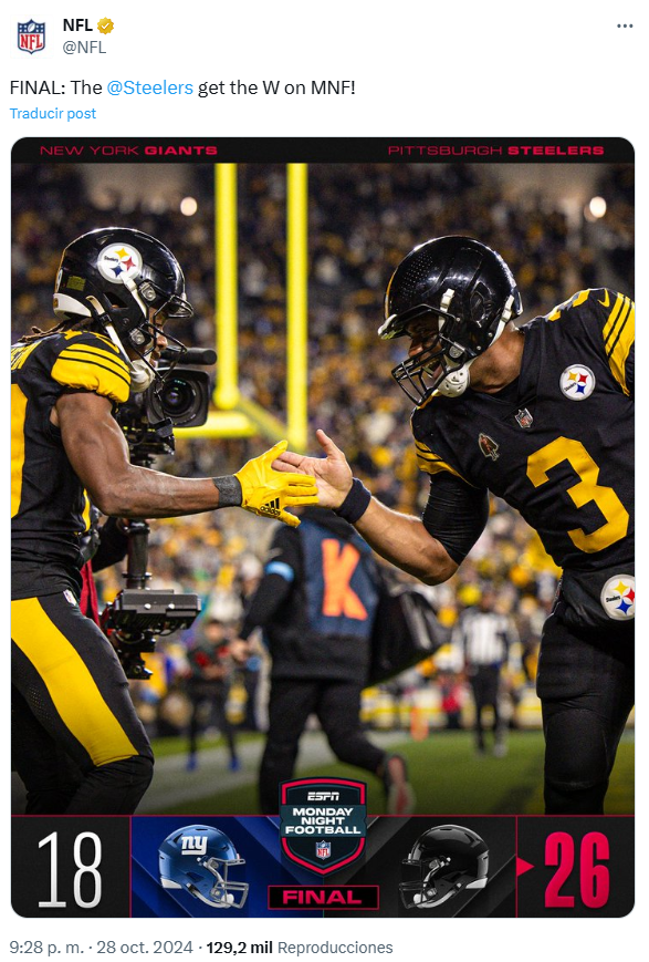 Los Pittsburgh Steelers comandados por Russell Wilson vencieron 26-18 a los New York Giants en su casa en el Acrisure Stadium en juego perteneciente a la Semana 8 de la Temporada 2024 de la NFL.