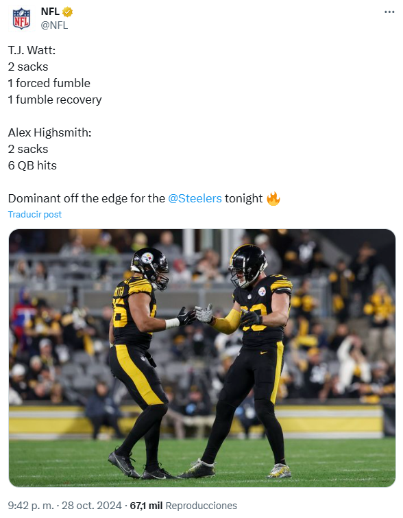 Pittsburgh no pierde de local en Monday Night Football desde 1991 lo que es toda una marca. Si alguien destacó fue T.J. Watt quien tuvo un gran juego porque la línea ofensiva de los Giants permitió 8 capturas en los últimos tres partidos y él lo sabía e insistió hasta que hizo una captura de quarterback a la hora más oportuna y recuperando además del balón suelto que provocó.
